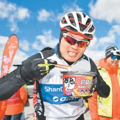 “騎闖天路”高海拔自行車極限賽場外,選手正在食用自嗨鍋。 品牌方供圖