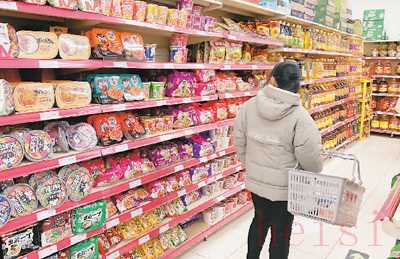 北京一家超市內的方便食品貨架。 本報記者 康 樸攝