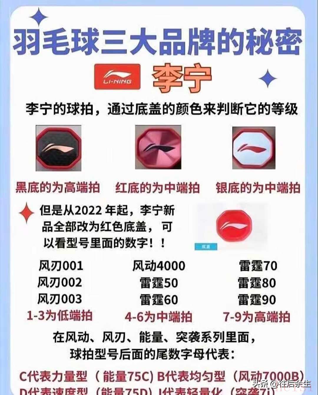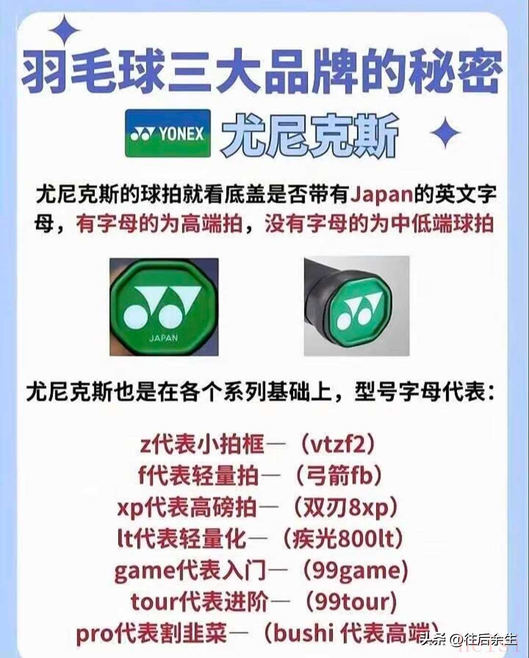 這三大品牌各有特色,李寧的型號數(shù)字和字母系統(tǒng)很清晰,尤尼克斯的“Japan”底蓋是高端象征,勝利的尾字母能精準(zhǔn)匹配打法。不管你是新手還是進(jìn)階愛好者,看懂這些秘密,選球拍時(shí)就能更有方向,找到最適合自己的那一款。