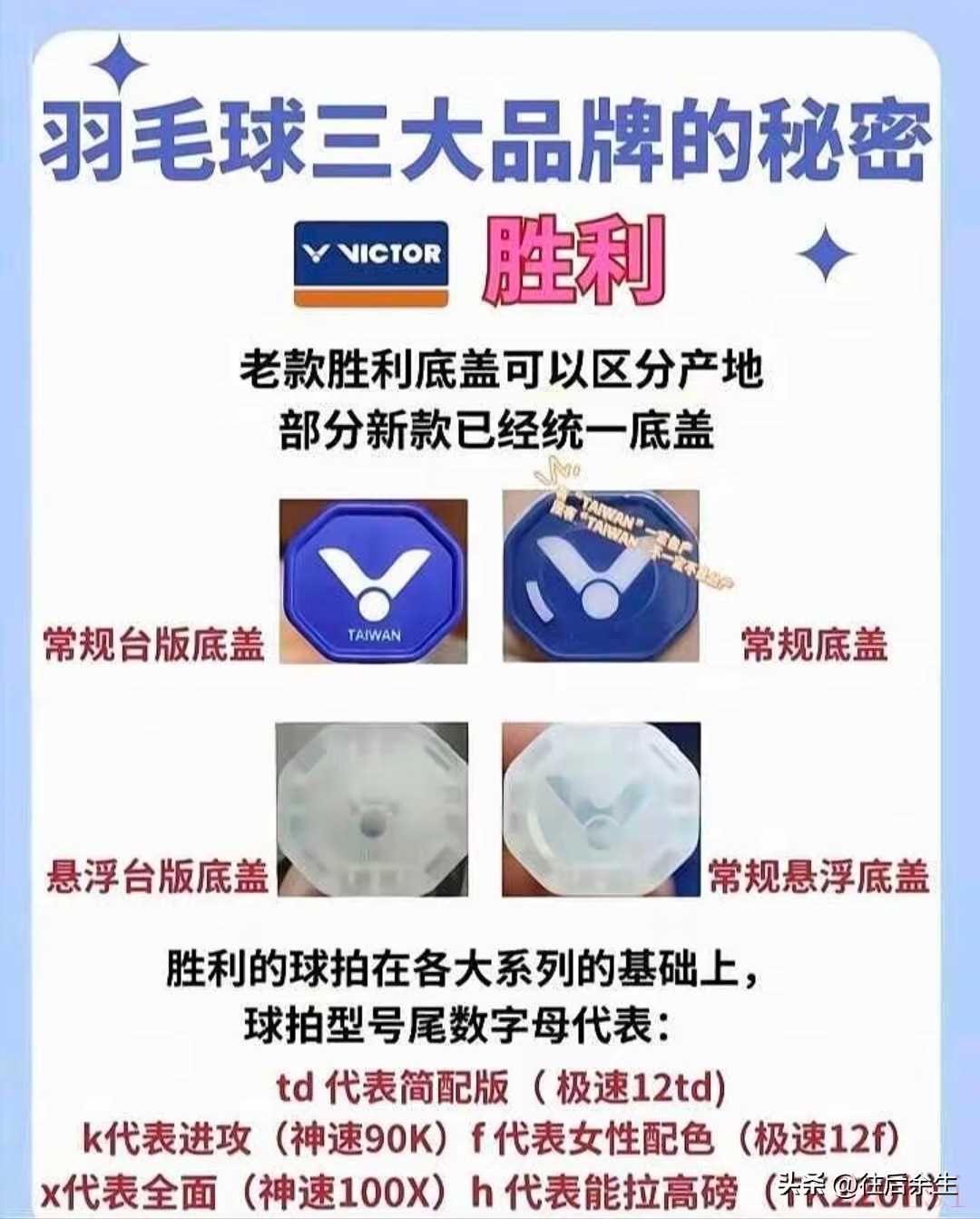 勝利老款球拍底蓋能區(qū)分產(chǎn)地,臺(tái)版和常規(guī)版不一樣,不過新款有些已經(jīng)統(tǒng)一了。型號尾字母也有含義,td是簡配版(極速12td)、k是進(jìn)攻型(神速90K)、f是女性配色(極速12f)、x是全面型(神速100X)、h是能拉高磅(TK220h),根據(jù)自己的打法和需求選準(zhǔn)沒錯(cuò)。