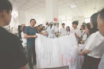 在閩南理工學(xué)院服裝與藝術(shù)設(shè)計(jì)學(xué)院,梁軍教授點(diǎn)評(píng)學(xué)生們的服裝設(shè)計(jì)作業(yè)。