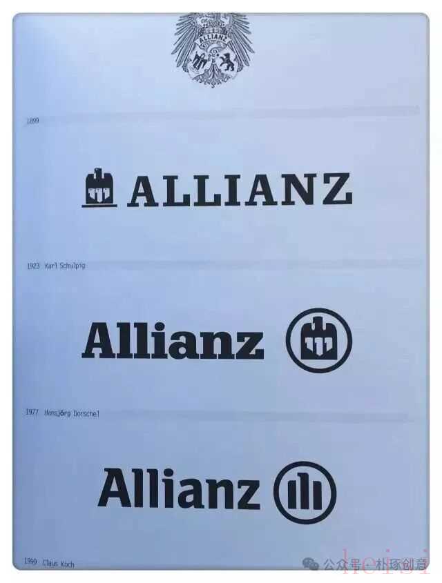 ALLIANZ1891 年:首版 LOGO 為裝飾性紋章,包含戴冠雄鷹圖案,直接借用德國帝國鷹符號,傳遞 “權威與可靠”,適配保險行業(yè)的信任需求;1923 年:簡化紋章元素,保留雄鷹核心,線條趨向現(xiàn)代,弱化皇室氣息,強化 “商業(yè)保險” 的專業(yè)屬性;1977 年:加入圓形框架,搭配粗體襯線文字,色彩定為藍白組合,藍色象征信任,白色代表專業(yè),視覺上更符合工業(yè)化時代審美;1999 年:里程碑式簡化 —— 將雄鷹抽象為三條豎線:中間線條頂端左轉形似鷹首,兩側線條上部圓弧模擬翅膀,徹底脫離具象圖案,僅保留象征基因,適配數字傳播場景。金融保險行業(yè)的核心訴求是 “在傳承信任基因的同時保持現(xiàn)代感”。安聯(lián)以 “雄鷹” 為精神內核,從具象紋章到極簡線條,既保留了 “可靠、力量” 的傳統(tǒng)聯(lián)想,又通過現(xiàn)代設計語言貼近年輕客群。這種 “傳統(tǒng)符號輕量化” 的轉化路徑,為百年金融品牌 “平衡歷史底蘊與時代審美” 提供了范本。