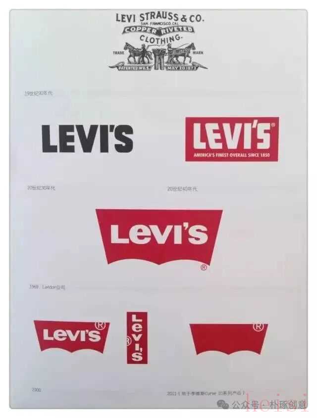 李維斯1873 年:首版 LOGO 為 “雙馬標”—— 兩匹馬試圖拉扯一條牛仔褲,直觀證明產品的耐用性,搭配 “Levi Strauss & Co.” 文字,主要用于牛仔褲后袋;1936 年:推出 “紅旗標” 設計,紅色背景上的 “Levi's” 斜體文字,適配牛仔褲側縫場景,增強視覺識別性,紅色象征 “活力與經典”;1960 年代:簡化 “雙馬標” 細節(jié),去除復雜背景,保留核心圖形與文字,適配年輕消費群體的審美需求;現(xiàn)代:形成 “雙馬標 + 紅旗標” 雙符號體系 —— 雙馬標傳遞 “耐用品質”,紅旗標強化 “經典潮流”,兩者既獨立適配不同場景,又共同錨定品牌核心認知。耐用消費品的核心需求是 “用視覺證明產品價值”。李維斯用 “雙馬標” 將 “耐用性” 這一核心賣點轉化為具象符號,歷經百年仍能讓消費者聯(lián)想到 “高品質牛仔褲”;而 “紅旗標” 則讓經典產品融入潮流語境。這種 “功能賣點符號化 + 經典元素