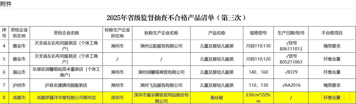 2025年5月,標稱深圳市富安娜家居用品股份有限公司生產(chǎn)的蠶絲被因纖維含量不合格被四川省市場監(jiān)督管理局通報。