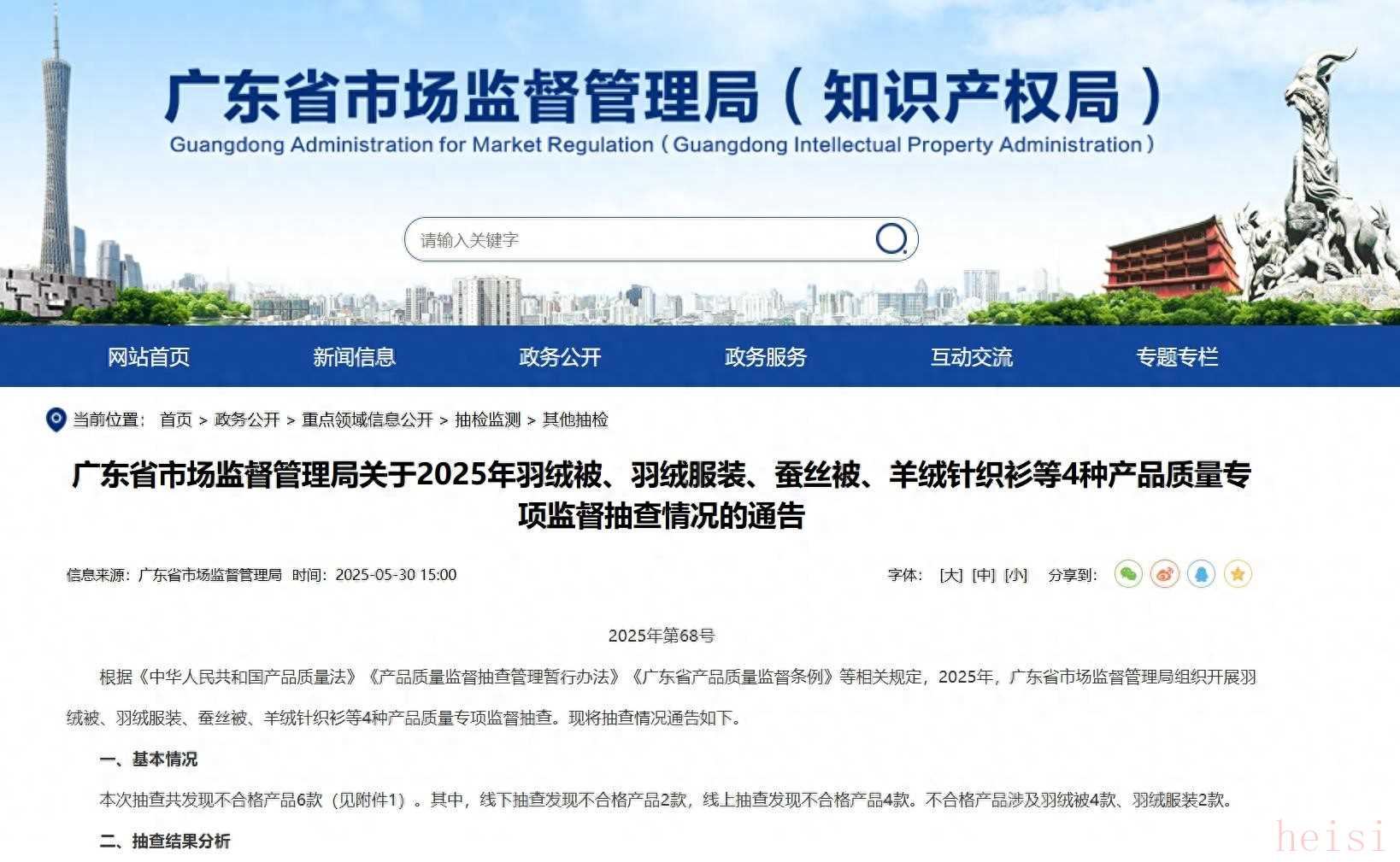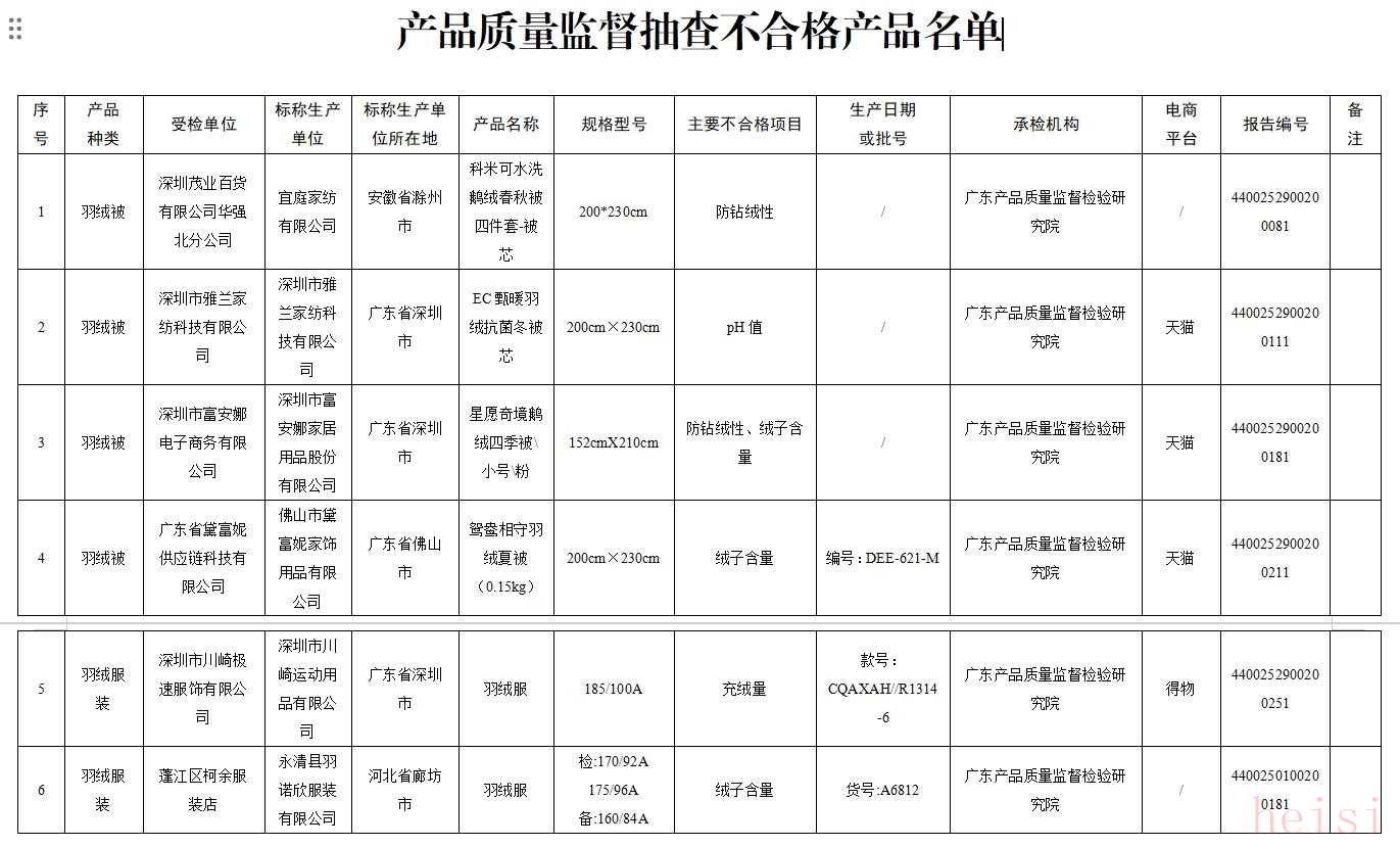 近日,廣東省市場監(jiān)督管理局發(fā)布關(guān)于2025年羽絨被、羽絨服裝、蠶絲被、羊絨針織衫等4種產(chǎn)品質(zhì)量專項監(jiān)督抽查情況的通告。