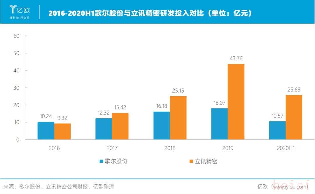 這一時期內(nèi),歌爾的研發(fā)費用分別為:12.32億元、16.18億元、18.07億元,三年合計研發(fā)投入46.57億元;立訊精密的研發(fā)費用分別為15.42億元、25.15億元、43.76億元,三年合計84.33億元;兩者也是相差近一倍。