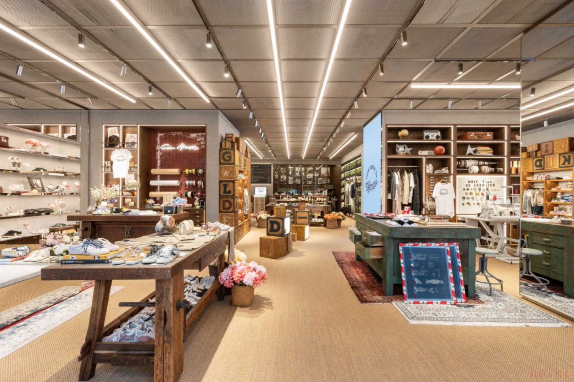 門店采用原始的清水混凝土墻面和地板,呈現(xiàn)出未經(jīng)雕琢的美感,店內(nèi)擺放著品牌團隊在世界各地旅行時所收集的紀念品,營造出溫馨的暖意氛圍。整體空間呈工業(yè)風,做舊設計的仿古地毯與回收再利用的復古木質(zhì)家具為其增添了一抹柔和。優(yōu)雅的鏡面展柜巧妙地與古樸家具相映成趣,共同展示著Golden Goose的最新系列。