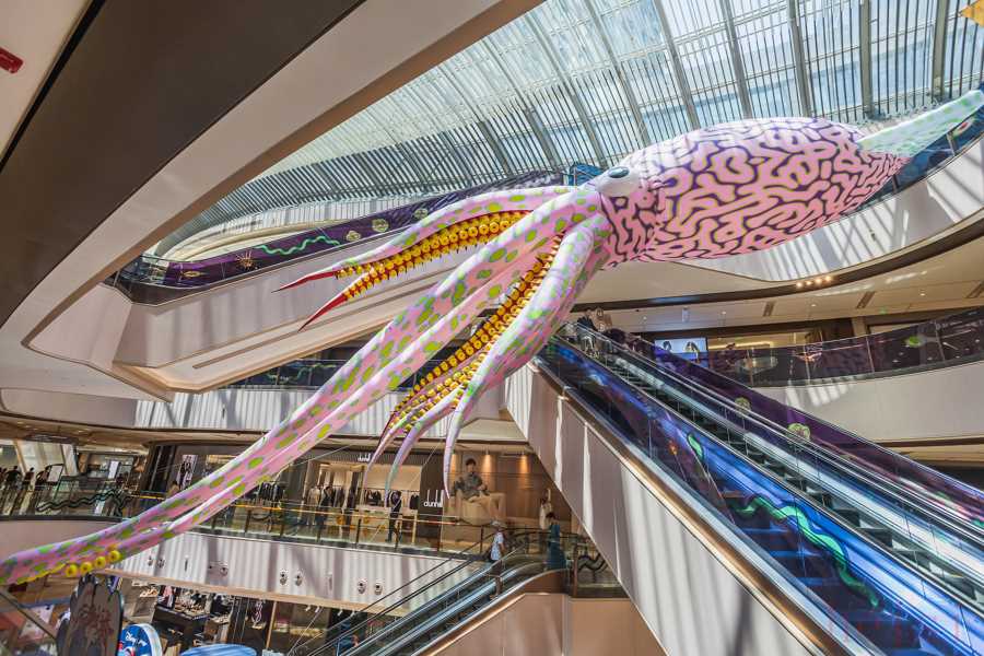 LG1中廳,竹川宣彰融合深奧議題與輕盈表達(dá),以“大航海時代”為靈感,打造一艘知識之舟《大知時代的航舟》,承載人類對知識的渴望與對方向的追尋。陳天灼全新作品《海語》橫跨四個扶梯區(qū),視覺縱深達(dá)300米,構(gòu)建出一頭遨游于都市“瀚?!钡啮L魚。作品圍繞“印跡、浮棲、觸發(fā)、回響”四個篇章展開,通過述說不同的生態(tài)敘事,喚醒人們對內(nèi)在生命力的感知。