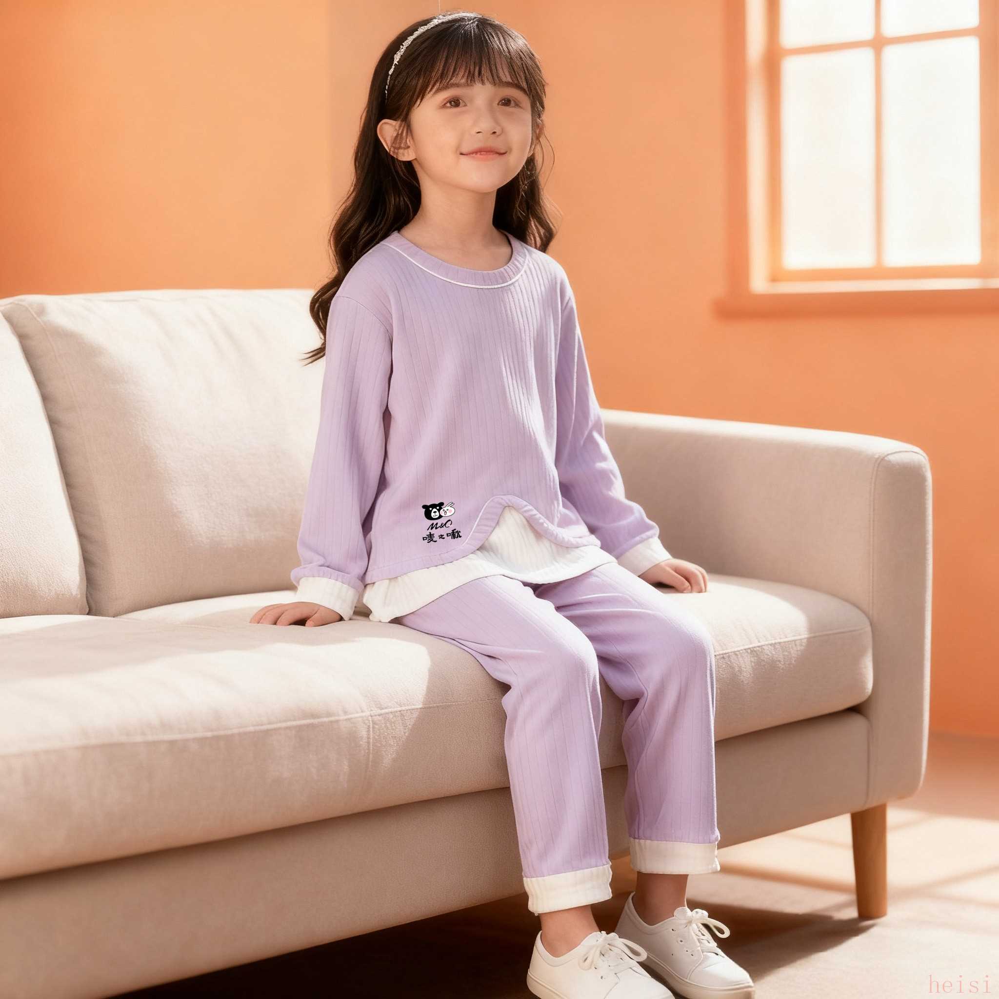 再看顏值,既要符合女寶的審美,又不能太花哨。主色調(diào)特意避開了濃烈的顏色,選了柔粉、鵝黃、淺紫、霧藍(lán)四種低飽和素雅色,襯得孩子膚色透亮,低調(diào)里透著精致感。細(xì)節(jié)上更用心,袖口、腳口和下擺都拼了干凈的白邊,像給睡衣鑲了圈月光,瞬間提亮整體,清爽又顯精神,比單調(diào)的純色睡衣更有潮流感,滿足女寶愛美的小小心思。