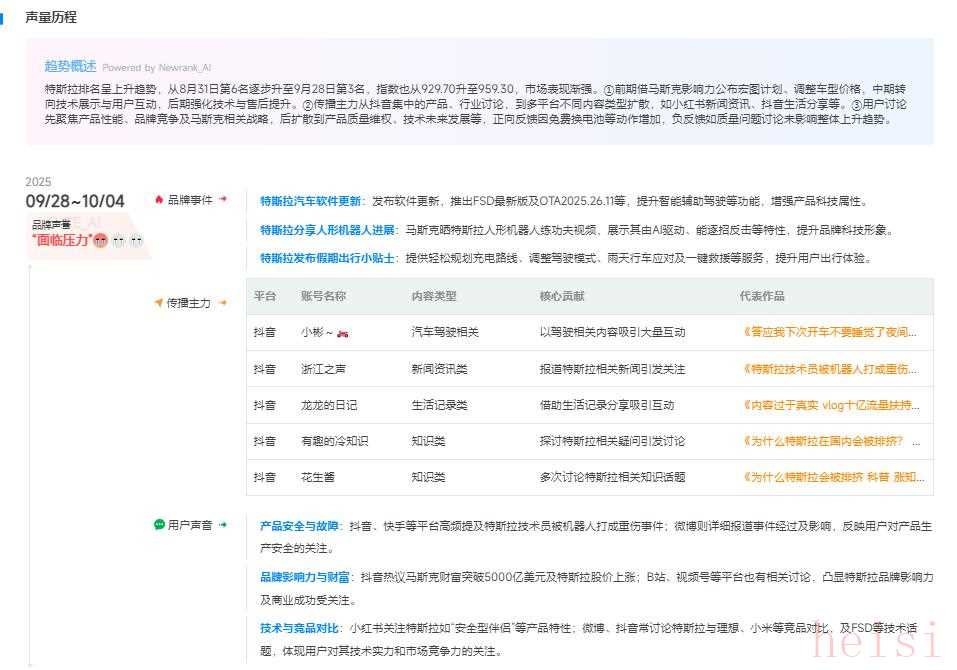 這條信息強調(diào)了特斯拉在市場上的強勁表現(xiàn)和高關(guān)注度。它不僅在特定的汽車榜單上排名靠前,而且其品牌在公眾和媒體中的討論熱度也極高(聲量指數(shù)950)。這反映了特斯拉強大的品牌影響力和市場地位。