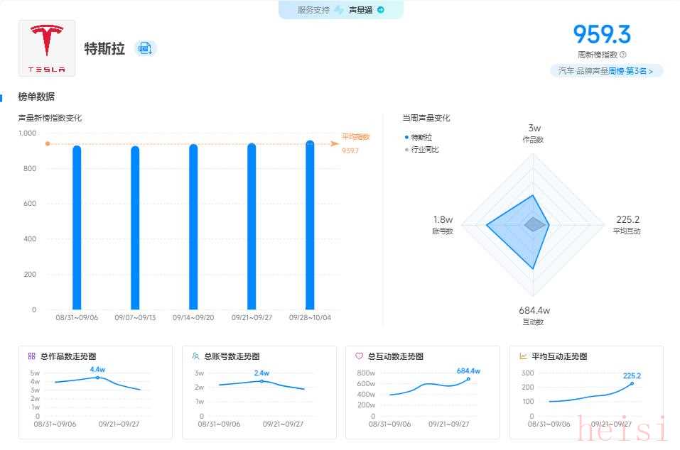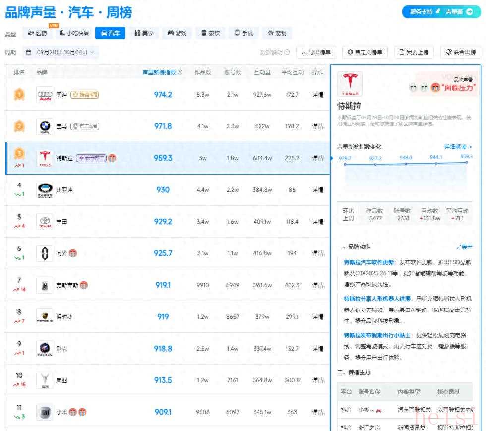 新榜品牌聲量?汽車周榜(09 月 28 日 - 10 月 04 日)發(fā)布,特斯拉以 959.3 的聲量新榜指數(shù)位居第三,環(huán)比上升 1 位 。
