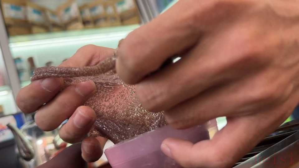 張浩在白云美灣廣場(chǎng)附近也經(jīng)營(yíng)著一家海藻面膜店。他說(shuō),店里的海藻面膜原料從東南亞進(jìn)口,“越細(xì)的分泌的膠狀物越黏稠,也就越貴”。
