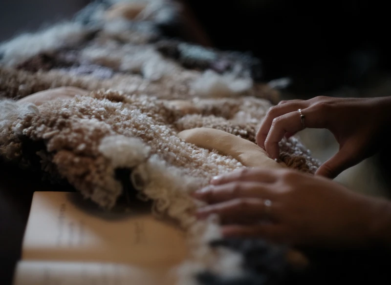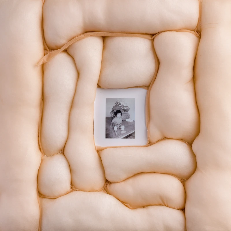 他的織品作品用簇絨槍來燒灼,在布料上用異材質(zhì)布料拼貼出起伏如水泡、如山稜的線條,不同的材質(zhì)拼接就像腿上的傷疤,起起伏伏、卻自有姿態(tài)。