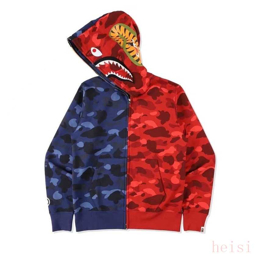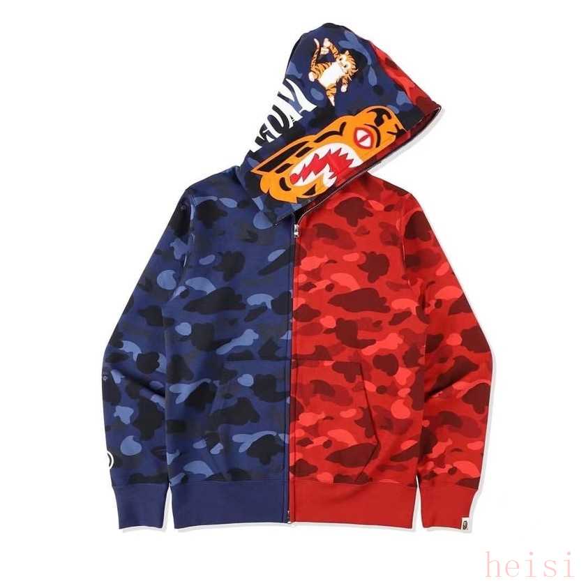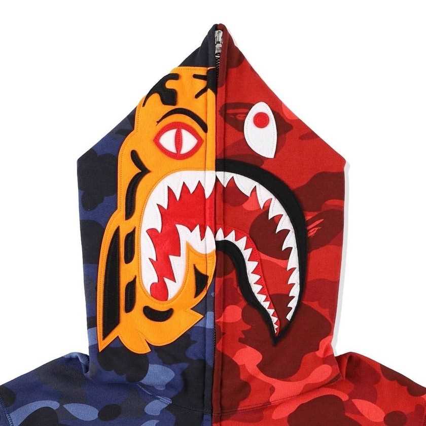 該連帽衫系列以 BAPE 經典的迷彩鯊魚頭和老虎頭為拼接元素呈現,一款是紅藍拼接,一款是紫綠拼接。
