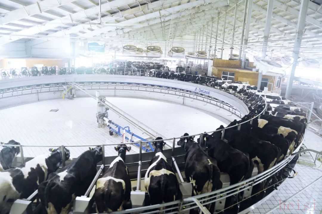 佩戴著智能項圈的黑白花奶牛在轉(zhuǎn)盤式擠奶機(jī)上擠奶,轉(zhuǎn)盤每輪 8 分鐘左右,一天四輪。