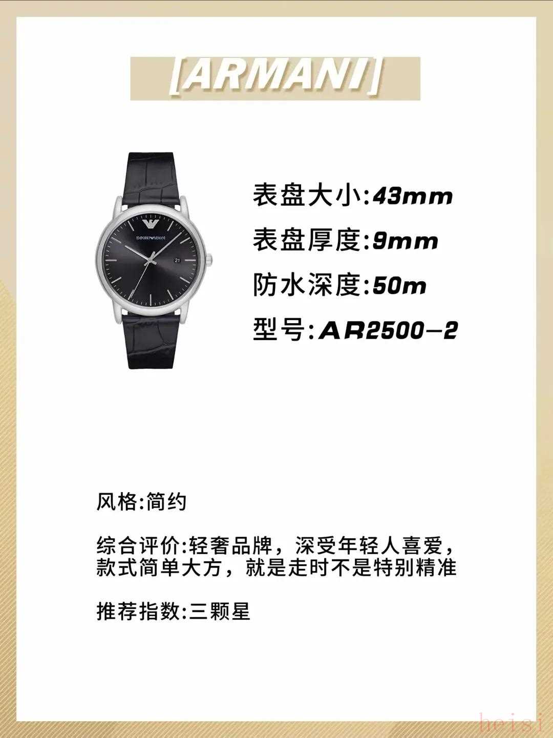 Armani AR2500-2:輕奢簡約風標桿!43mm表盤+皮帶,黑盤銀框經典耐看,雖然走時精度稍弱,但顏值能打,年輕人閉眼沖~