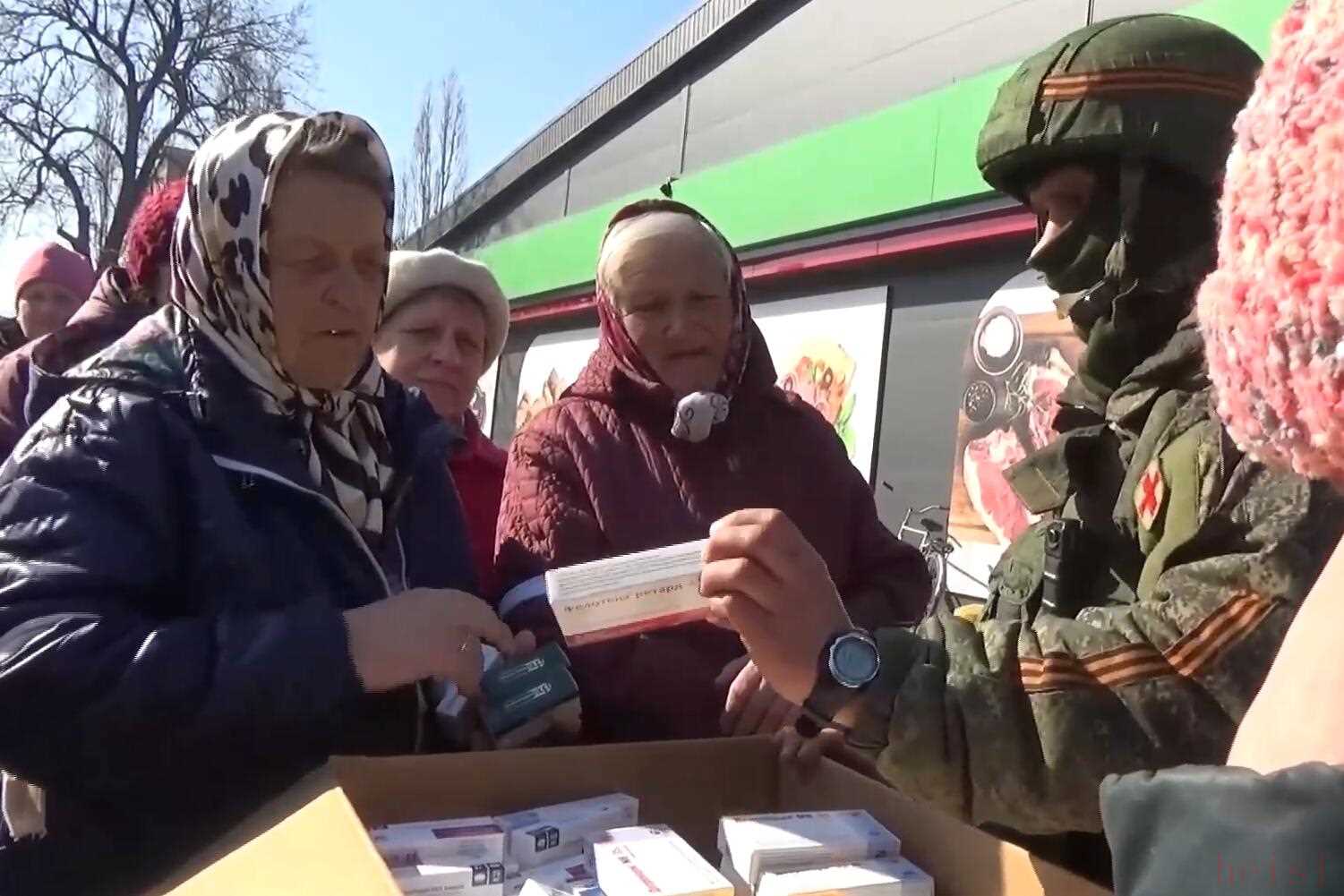 俄軍此前向當(dāng)?shù)孛癖娞峁┑娜说乐髁x援助物資中,除了肉蛋奶和水果蔬菜,還有藥品