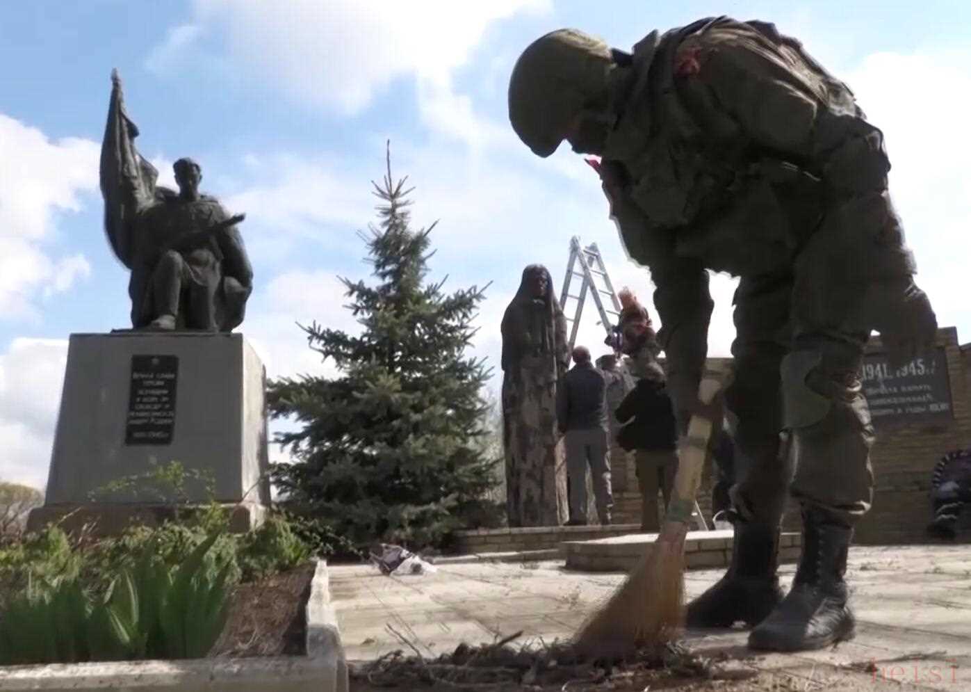 烏克蘭東部鄉(xiāng)村春季,俄軍到來后整修村里的蘇軍紀(jì)念碑,青年官兵向老人送上禮物和鮮花