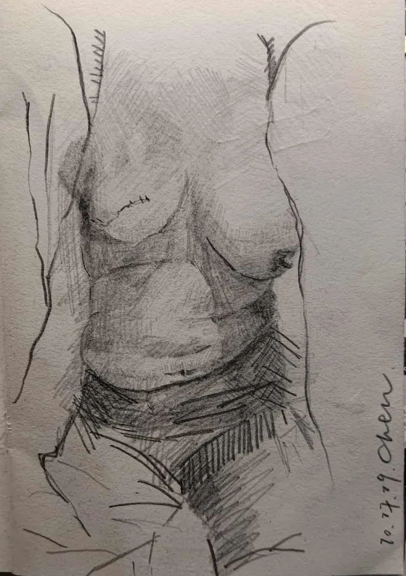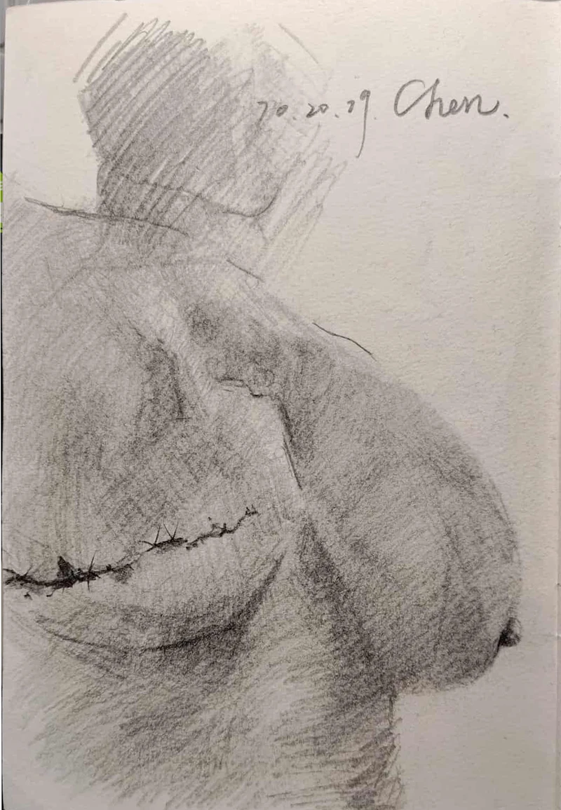 陳怡君開始用畫筆紀錄自己的身體:陳怡君忍不住又開了自己玩笑:他形容當時裝了引流管的身體:漫長治療過程中,陳怡君完全抽離自己,就當做在進行一個藝術創(chuàng)作計畫,紀錄病程心情。