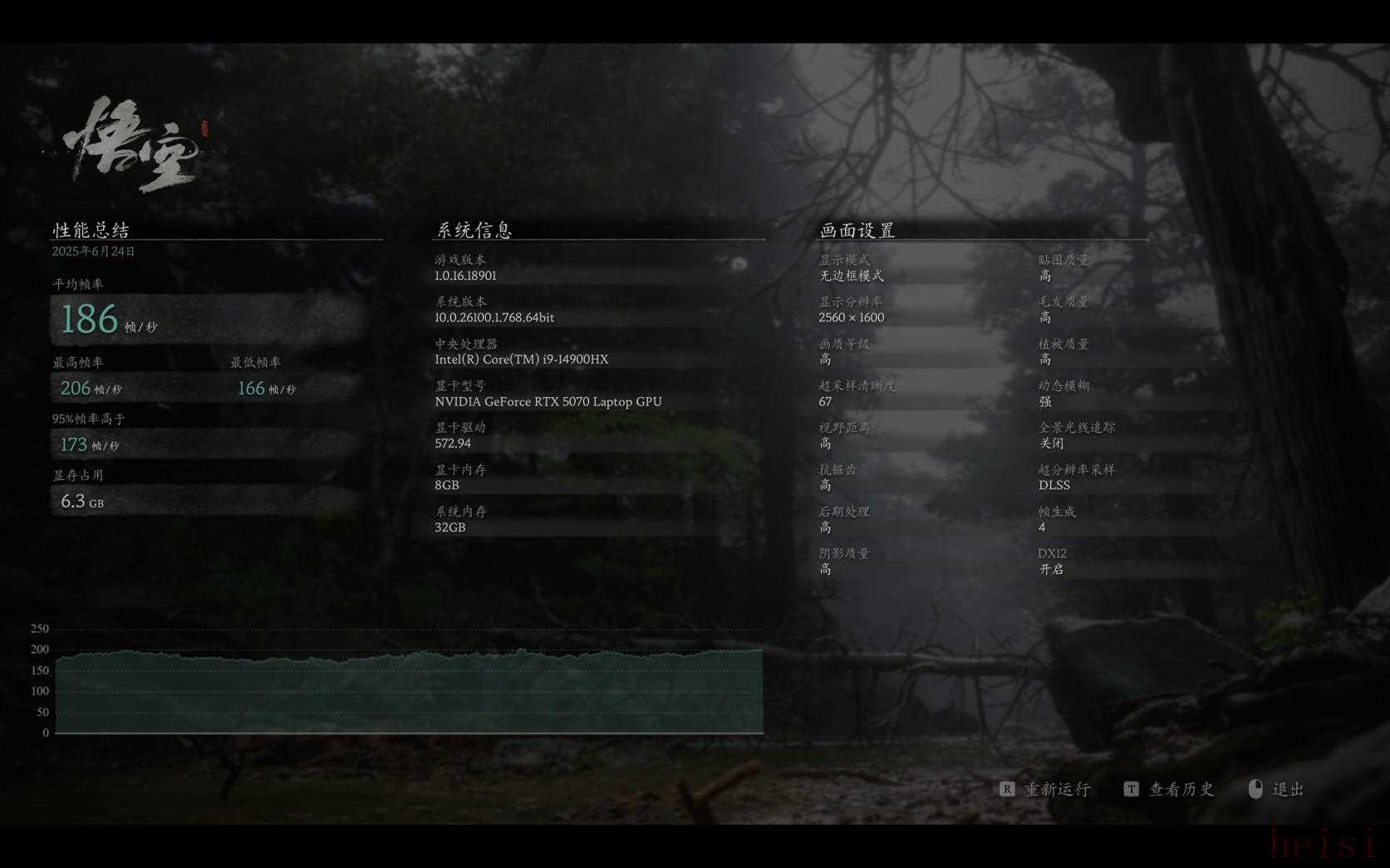 我們首先選擇了已經(jīng)支持了DLSS4的國產(chǎn)3A大作《黑神話:》,測試分辨率為2.5K、預(yù)設(shè)高畫質(zhì)、關(guān)閉全景光線追蹤并開啟DLSS4,通過《黑神話:》自帶的性能測試,獲得了平均186幀的出色成績,流暢度非常不錯(cuò)。