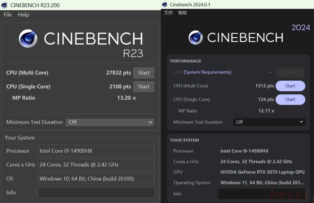 接下來我們進(jìn)行Cinebench測試,在CinebenchR23測試中,i9-14900HX多核成績?yōu)?7832pts、單核成績?yōu)?108pts;在Cinebench2024測試中,多核成績?yōu)?512pts、單核成績?yōu)?24pts。但從成績上來看,酷睿i9-14900HX雖然不是最新一代的處理器,但依舊擁有強(qiáng)勁的性能,毫不遜色于最新一代處理器,依舊處于全能游戲本中的第一梯隊(duì)水平。