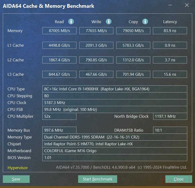 內(nèi)存方面,iGameM16Origo采用了由兩條16GB組成的32GB雙通道DR5內(nèi)存,AIDA64實(shí)測讀取速度為87005MB/s、寫入速度為77655MB/s、復(fù)制速度為79050MB/s、延遲為83.9ns,處于中上水平。