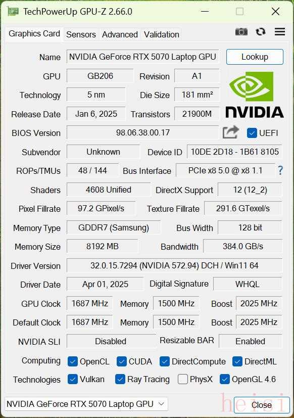 顯卡方面,iGameM16 Origo搭載的是一塊RTX5070 LaptopGPU,基于英偉達(dá)最新的Blackwell架構(gòu)打造。GPU-Z實(shí)測其擁有4608個(gè)CUDA核心,AI算力高達(dá)798TOPS。8GBGDDR7顯存,核心頻率為1687MHz,Boost頻率為2025MHz,位寬為128bit,峰值功耗可達(dá)115W。