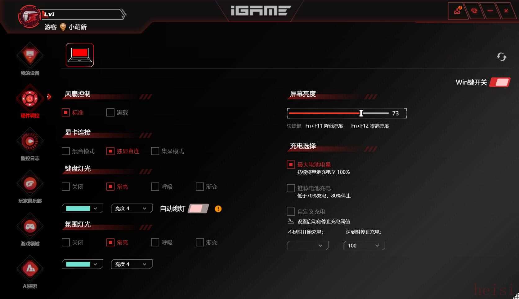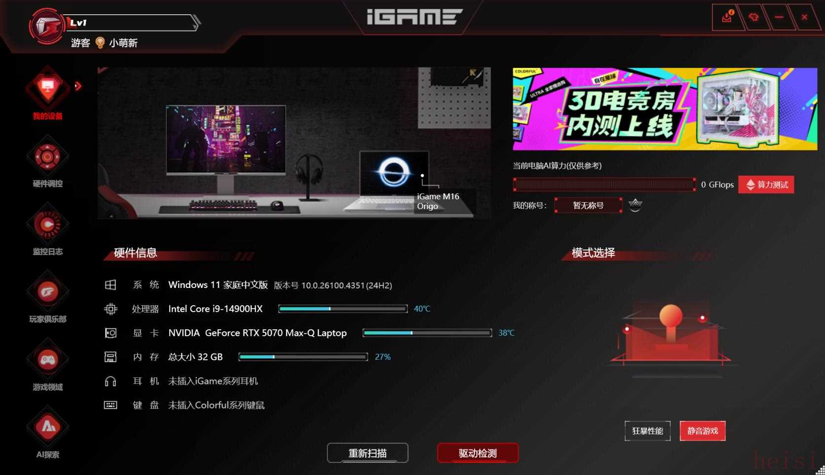 最后我們再來看一下軟件方面,這次iGame為M16Origo預(yù)裝了自在星球和星知島兩款軟件。自在星球是iGameM16Origo的控制軟件,玩家可以在這里查看電腦的詳細(xì)硬件信息;調(diào)節(jié)性能、安靜等模式;選擇顯卡模式以及RGB燈效等。同時(shí)自在星球還內(nèi)置了實(shí)時(shí)監(jiān)控功能,玩家可以實(shí)時(shí)監(jiān)控各硬件的占用情況,而無需下載第三方軟件。