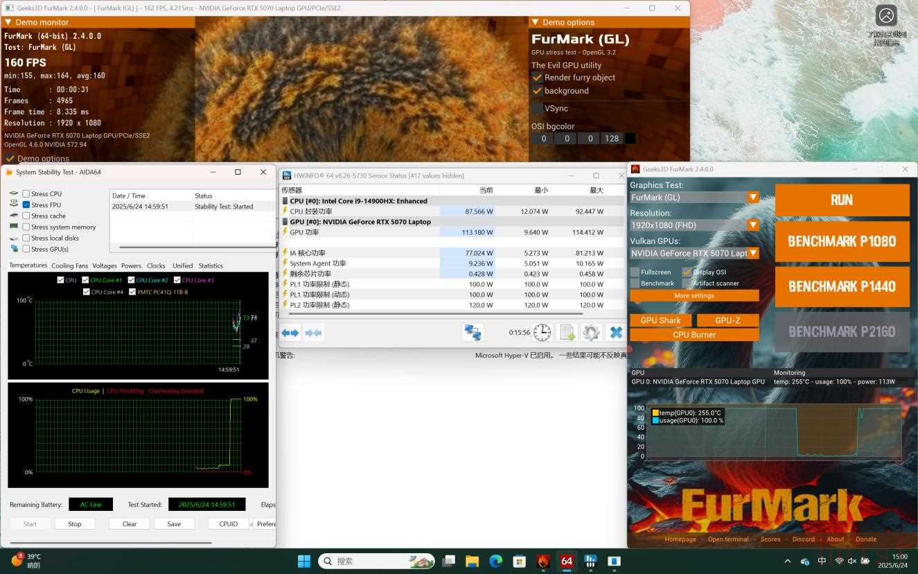 從核心硬件的理論性能測試中我們可以看到,iGameM16Origo整體的得分表現(xiàn)非常不錯(cuò),保證這些高分的背后,是滿血的性能釋放以及出色的散熱系統(tǒng)。在雙烤測試中,狂暴性能模式下CPU封裝功率基本穩(wěn)定在85W左右,GPU功率基本穩(wěn)定在115W左右,整體可以帶來200W+的性能釋放,在同級別中表現(xiàn)不錯(cuò)。