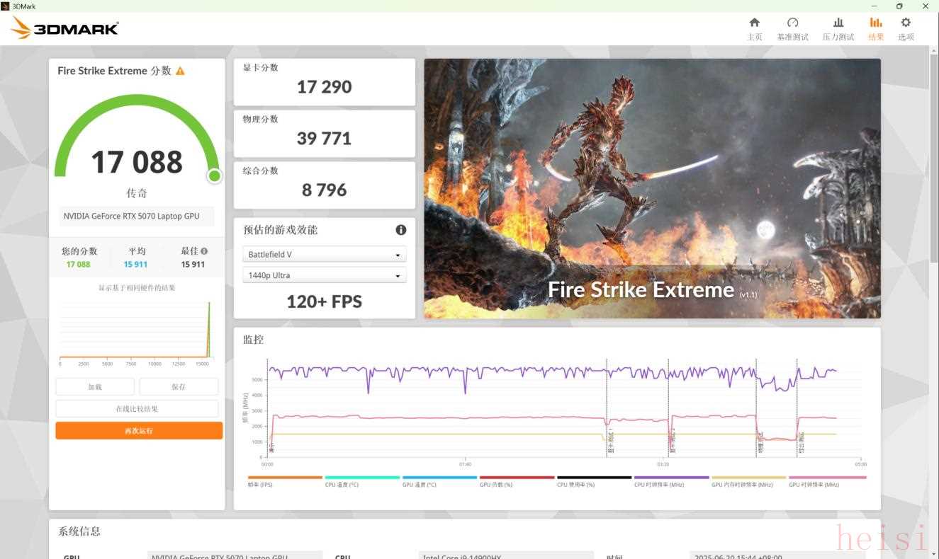 我們使用3DMARK來進(jìn)行測試,其中在衡量顯卡2K、DX11理論性能的FireStrike Extreme測試中得分為17088。