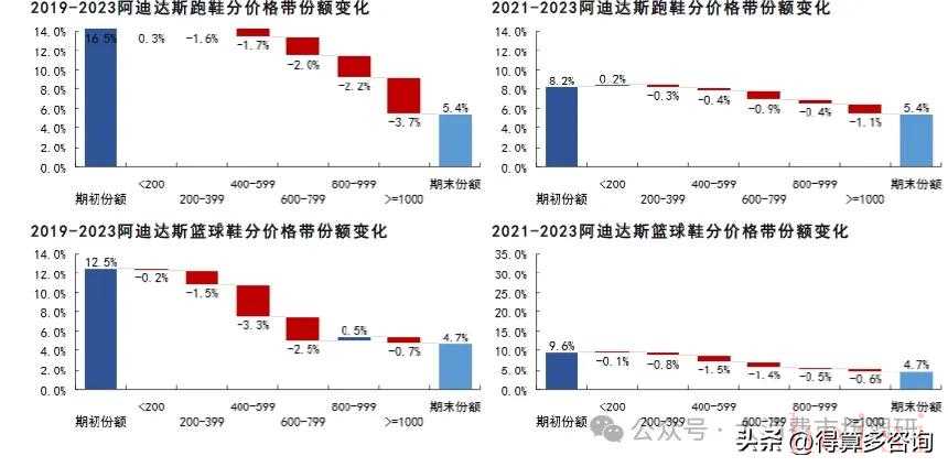 3. 運(yùn)動休閑鞋份額變化分價格拆解:高價格段運(yùn)動休閑鞋占比下降明顯,各價位段份額均下滑。目前價格帶占比最大的是400-600元價位段,近年來占比持續(xù)小幅提升;中高價格段占比較為穩(wěn)定;千元以上高價格段2022年以來占比明顯下降。2023年阿迪達(dá)斯運(yùn)動休閑鞋份額7.0%,比2019、2021、2022年均有下滑,尤其近年來相較2019年份額下滑明顯。對份額拖累最大的是千元以上的高價格段,200元以上各價位段份額也均下滑。近三年個價位段份額變化較小。