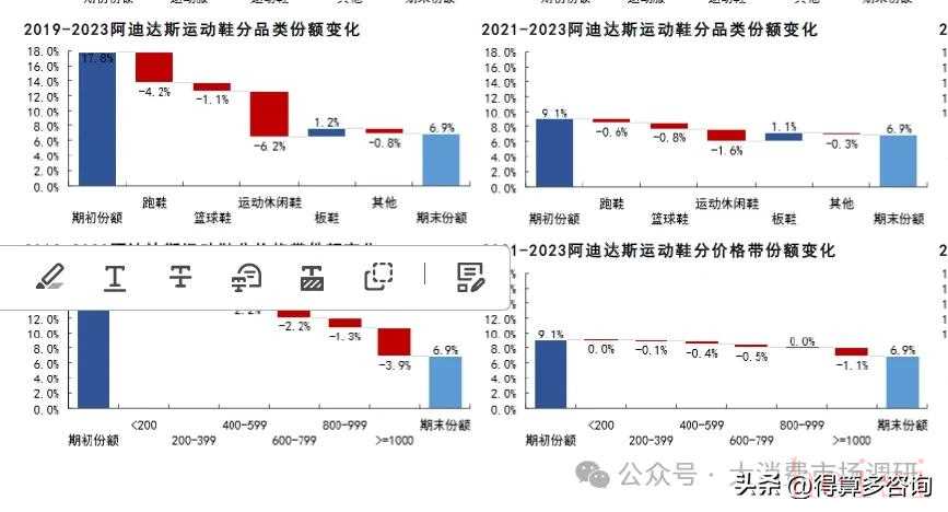 ? 整體份額變化分品類拆解:運(yùn)動鞋是影響份額變化的主要品類。阿迪達(dá)斯的運(yùn)動鞋銷售占整體超過6成。2023年阿迪達(dá)斯運(yùn)動服飾占大盤份額4.7%,比2019、2021、2022均下降。整體份額下降主要來自運(yùn)動鞋品類,運(yùn)動服品類份額也有小幅下降。
