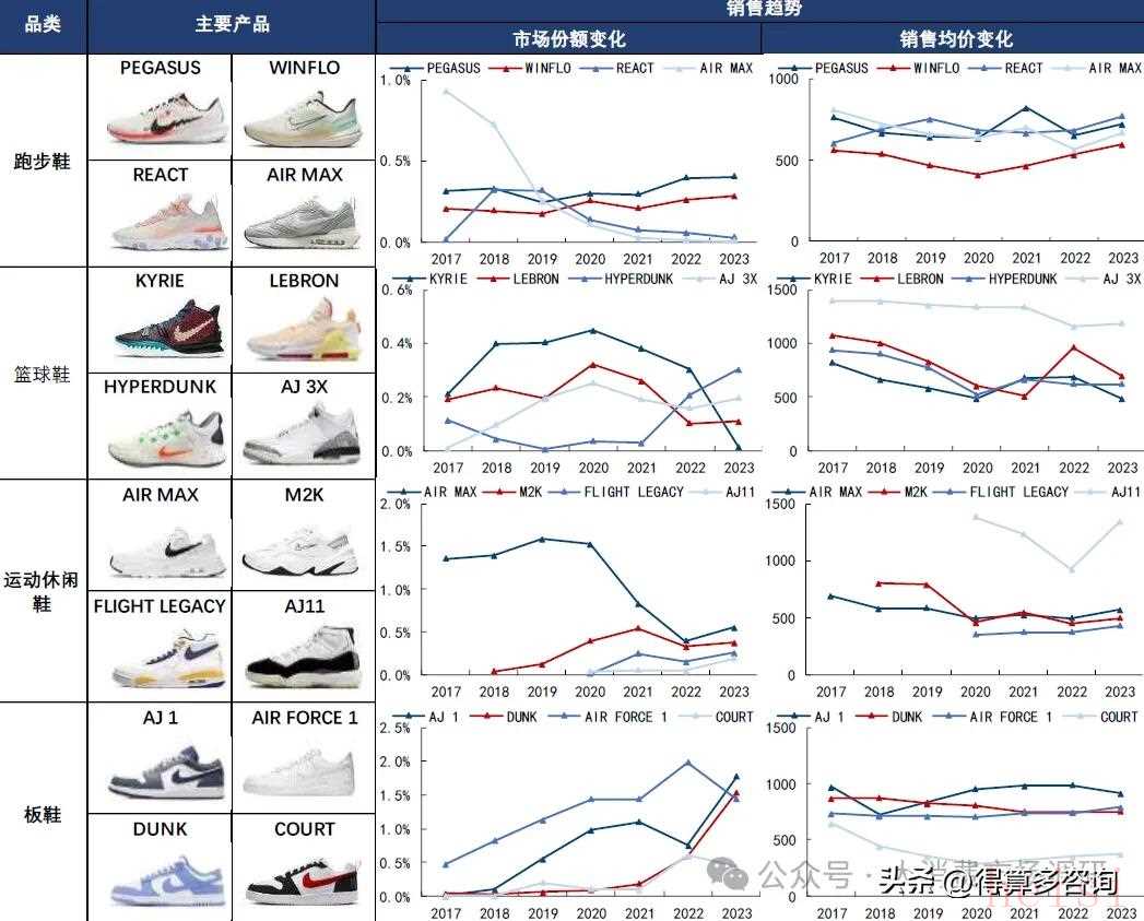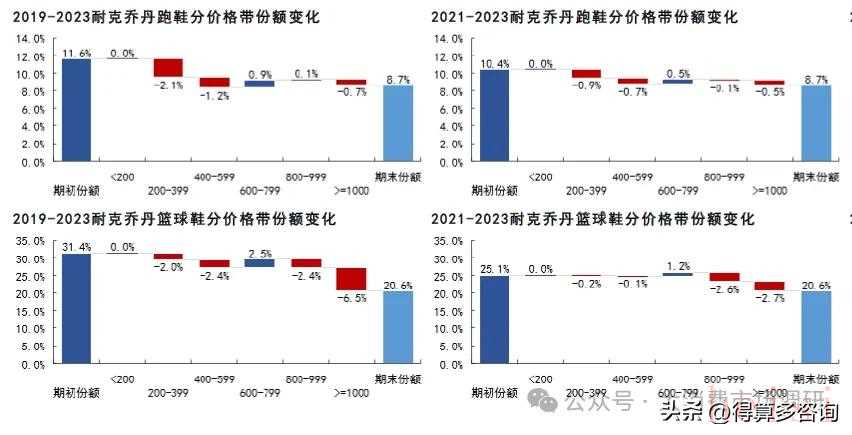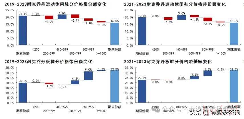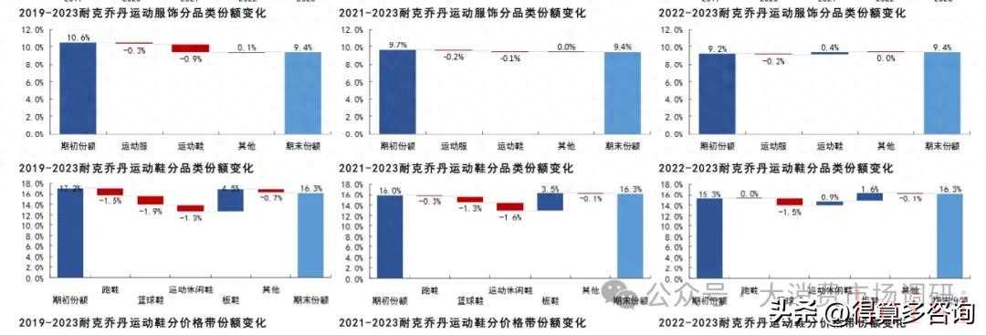 耐克喬丹:相比疫情前份額下降,受中低價位段專業(yè)品類拖累,2023年時尚品類驅(qū)動份額同比回升