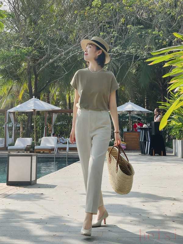 T恤、九分褲,就勝在款式簡單、設計簡約。將兩種簡單的服裝搭配出來,呈現(xiàn)出清爽又大方的氛圍感。整套造型沒有多么華麗浮夸的裝飾和設計,單單是加入了珍珠項鏈與遮陽帽、同色系包包,就讓人感受到清涼與舒緩,好似是山澗中緩緩流出的溪水,撫平我們內心的燥熱,也沖淡了天氣熱所帶來的悶熱感。