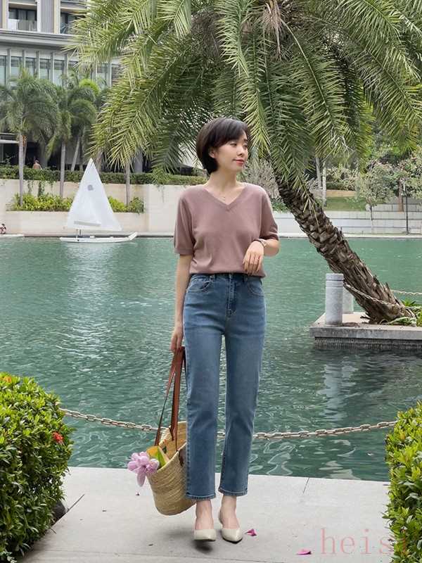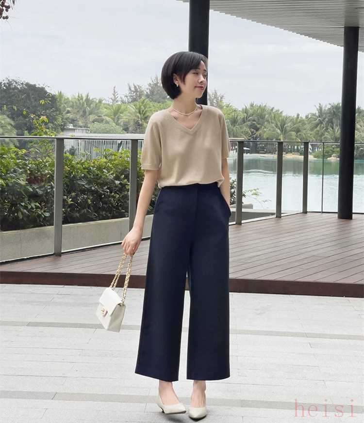 夏初穿九分褲搭針織T恤,也不能過于隨性了。建議選擇V領的針織T恤,帶有V領的設計,將精致鎖骨、白皙肌膚、優(yōu)越脖頸線條完美露出。這樣露出的肌膚分寸得當,使得整體呈現(xiàn)出透氣性極強的效果,完美避開了沉悶與不通氣的情況,使得自身的清爽氣息從裸露出來的肌膚處自然流露,讓造型更顯涼爽與端莊。