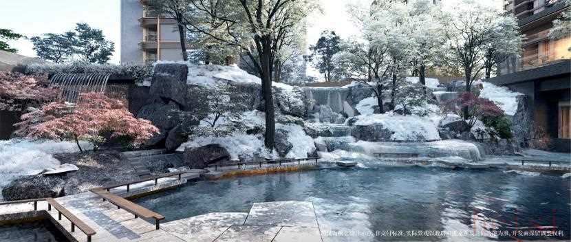 在整體規(guī)劃的骨相上,項目延續(xù)中國傳統(tǒng)山水格局,北倚山勢,南臨水域,形成山水環(huán)抱、負陰抱陽的格局。宅隱于園,三進宅第。園內(nèi)構(gòu)建約4.5萬方宏闊又精微的山水體系;千瀑飛雪,約45米寬瀑布群;約3000㎡水域、約2000㎡水畔東坡、銀杏山林、約120米櫻花堤岸,共同構(gòu)成可居可游的沉浸式園林體驗。