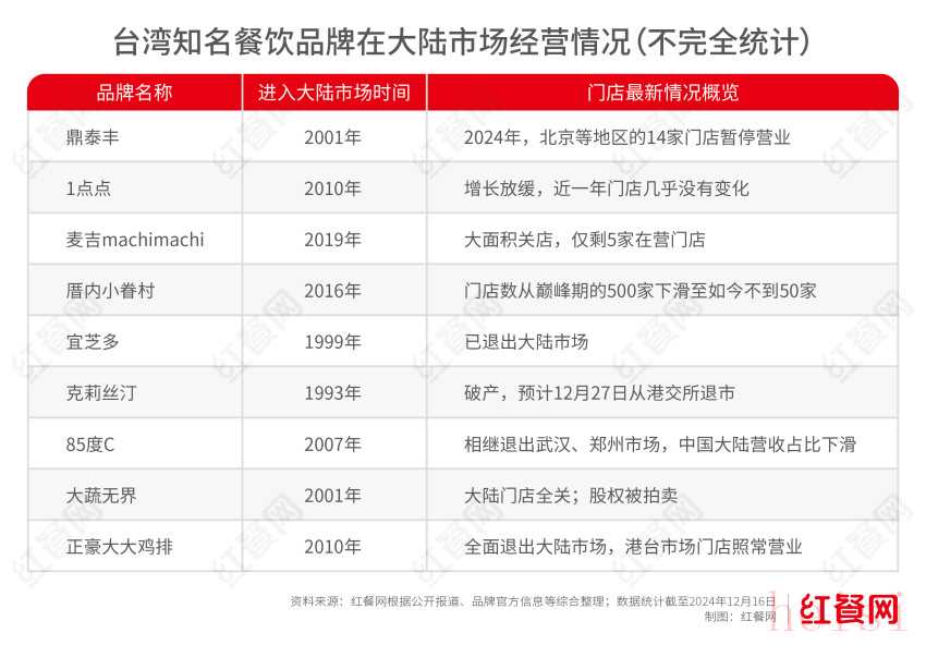 與香港餐飲品牌的處境類似,臺灣餐飲品牌近年來也在大陸市場不斷退潮。