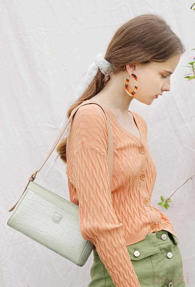因?yàn)樗野迅嗟臅r(shí)間花在了皮料的揀選,設(shè)計(jì)上都是純色的簡(jiǎn)約風(fēng),更加突出了皮料和五金的質(zhì)感。賣得最好的,是這個(gè)桃花粉寬肩法棍包