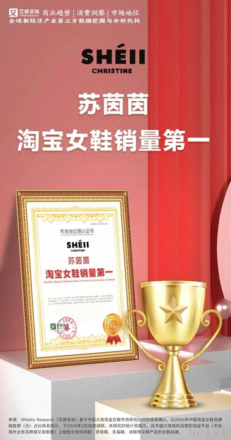2025年2月,全球新經(jīng)濟(jì)產(chǎn)業(yè)第三方數(shù)據(jù)機(jī)構(gòu)iiMedia Research(艾媒咨詢)基于CMDAS大數(shù)據(jù)系統(tǒng)監(jiān)測(cè)及市場(chǎng)研究比對(duì),正式授予SHEII蘇茵茵“淘寶女鞋銷量第一”的市場(chǎng)地位確認(rèn)。這一里程碑式的認(rèn)可,不僅印證了品牌十余年從渠道依賴型商家到生態(tài)化品牌價(jià)值驅(qū)動(dòng)者的蛻變,更揭示了中國(guó)新銳消費(fèi)品牌在存量競(jìng)爭(zhēng)時(shí)代的破局邏輯。
