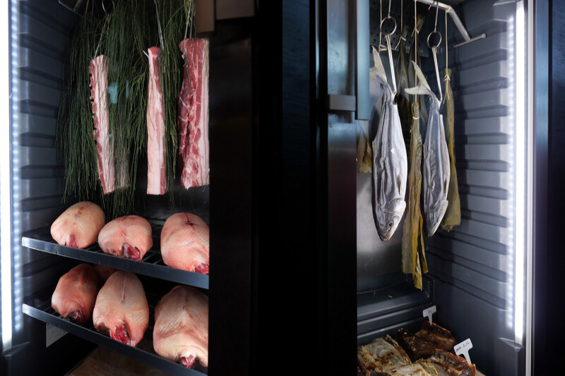 在餐會開始前,Chef André 帶大家走進藏在餐廳角落的熟成室。期望客人能透過同一條魚,看見時間的三種樣貌,包括現(xiàn)流、烹調(diào)后與熟成后。會有這樣的想法,其實是因為宜蘭的地理位置正好讓漁獲上岸后能立刻放血處理,為熟成提供了理想條件。為了迎接的到來,餐廳也將 Chef Matteo 喜愛的自然元素帶進熟成箱,像是以以五葉松包裹豬肉與鴨肉、昆布與魚肉一起陳列,為視覺帶來一致風(fēng)格。