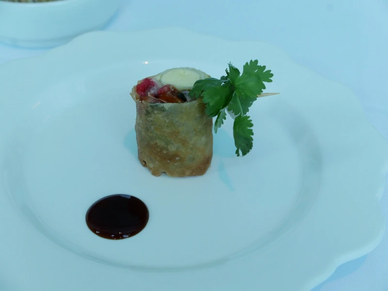 以宜蘭最有名的小吃作為開場,主廚以創(chuàng)意手法重組這道熟悉的街頭滋味。以春捲皮取代豆包,包入紅糟肉、豬頭皮、鳥蛋與香腸,炸至金黃酥脆,外層薄香、內(nèi)餡飽滿,吃起來既有層次又保留在地風(fēng)味。搭配特調(diào)甜辣醬、醬油膏,除了嚐得到傳統(tǒng)鹹香也不失細膩。