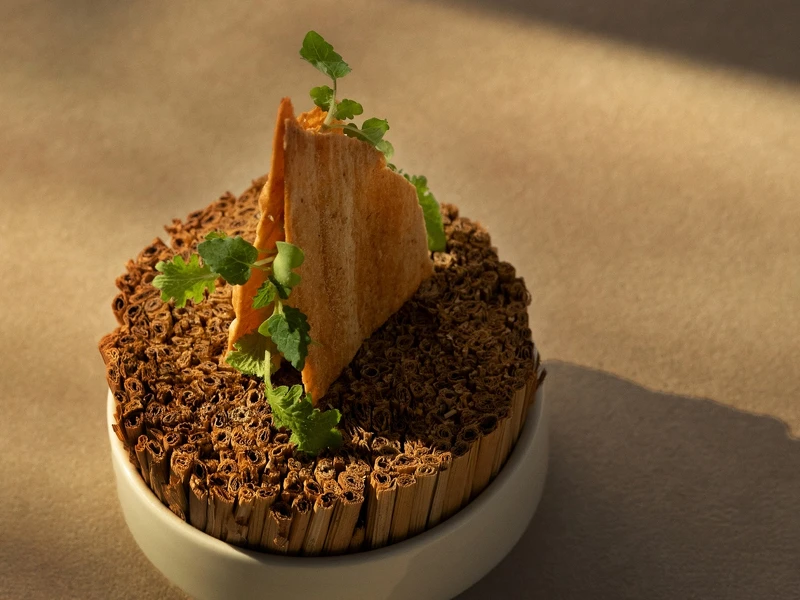 而Chef Matteo 第一次聞到臺灣原生香料時,就立即被那股帶著柑橘調(diào)的清香吸引,于是以它取代原本常用的日本柚子,讓整體風(fēng)味更明亮、也多了辛香層次。底層再以稻梗作為擺盤,象徵稻米的循環(huán)與土地的完整,從米糠到稻梗、從穀粒到餐桌,所有元素都被轉(zhuǎn)化為料理的一部分,海味與米香、酥脆與鮮甜交織出宜蘭與金澤共同的秋日風(fēng)景,十分迷人。