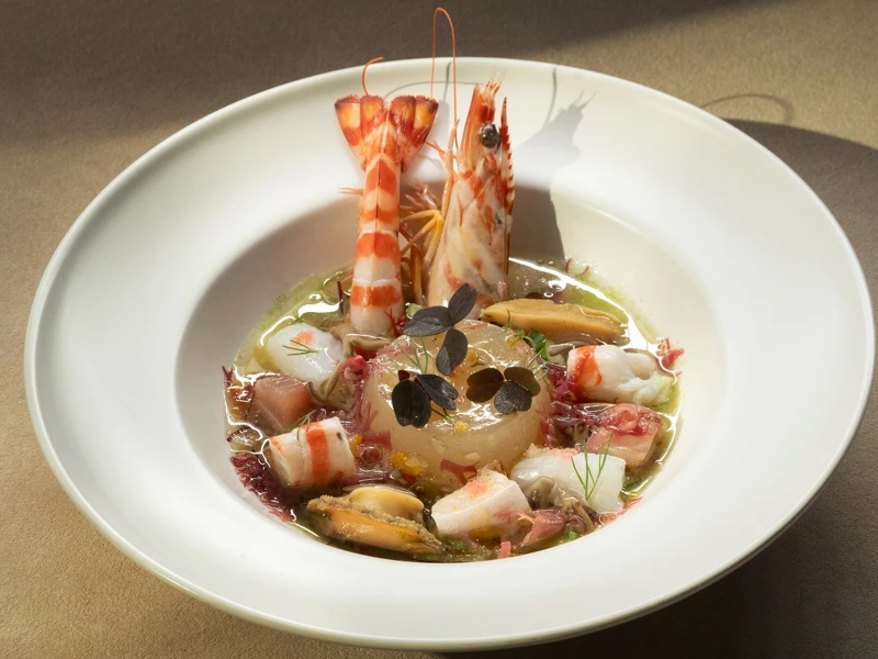 主廚以鹹食呈現(xiàn),打破了大家對石花菜多半作為甜品的印象。而虎蝦僅煮至七、八分熟,肉質(zhì)彈嫩,與清涼的石花凍形成鮮明對比。整道菜不僅展現(xiàn)海洋風(fēng)味的多層次,也讓人從一口中感受到宜蘭獨特的飲食文化。