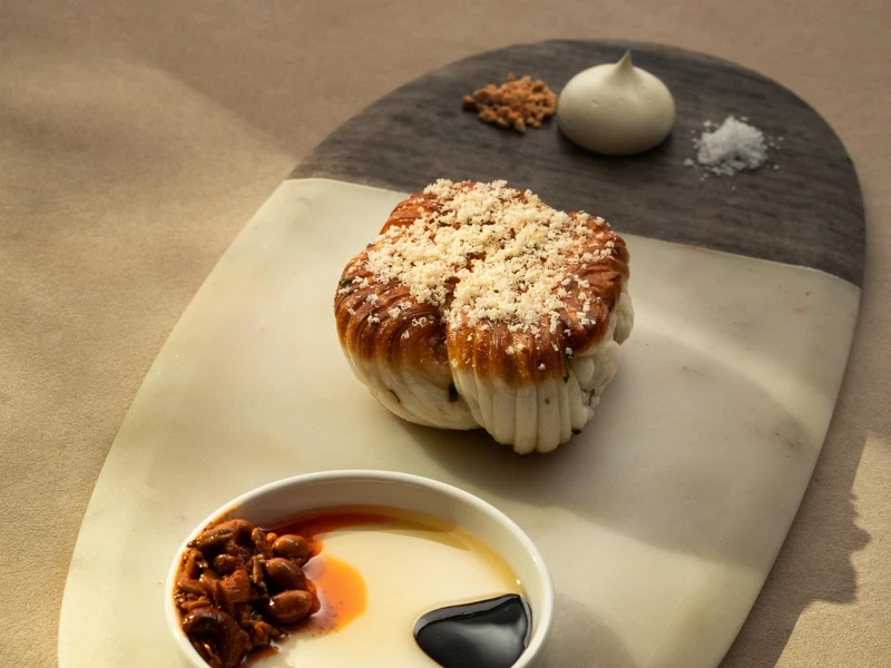 這道料理是廚的招牌菜色,展現(xiàn)餐廳并存的理念。選擇用宜蘭的做成花捲,打破一般西餐廳總以歐式麵包作為搭配的公式。主廚將蔥花揉入麵糰,白綠交錯的紋理在烘烤后自然膨鬆,再煎至外層金黃酥脆,最后撒上榛果碎增添香氣。食用時可以搭配特製五仁果醬、巴薩米克醋與花生油三種沾醬,蔥香、堅果香與酸香交織出層次,也讓熟悉的風(fēng)味多了一份優(yōu)雅與新鮮感,義式精神與宜蘭風(fēng)土在一口中完美展現(xiàn)。