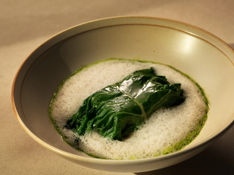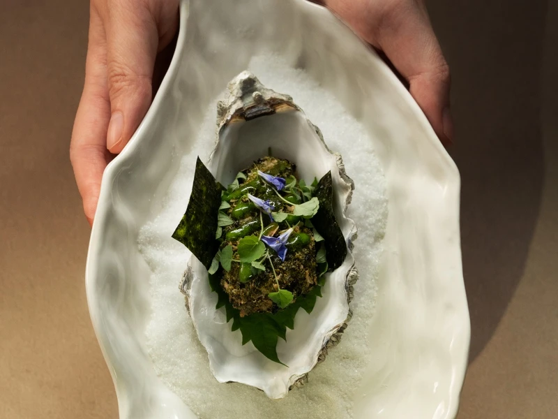 這道料理以海藻、海鮮為主角,靈感來自日本與臺灣同樣豐富的海洋資源。Chef Matteo 認為,海鮮與海藻在兩地文化中都有深厚連結(jié),因此選擇以炸製手法呈現(xiàn),而非生食。他也特別解釋,這樣能更穩(wěn)定食材品質(zhì),也能帶出不同層次的香氣與口感。 料理中運用了兩種海藻,紫菜先被捏碎后與麵包粉混合,以約二比一的比例製成酥炸外層,讓海藻香氣更濃郁而不苦澀。海苔與紫蘇則分別為醬汁與裝飾增添層次,紫蘇在整體風(fēng)味中帶來清新香氣。整道料理能同時感受到海味、蔬香與酥香交融的滋味。