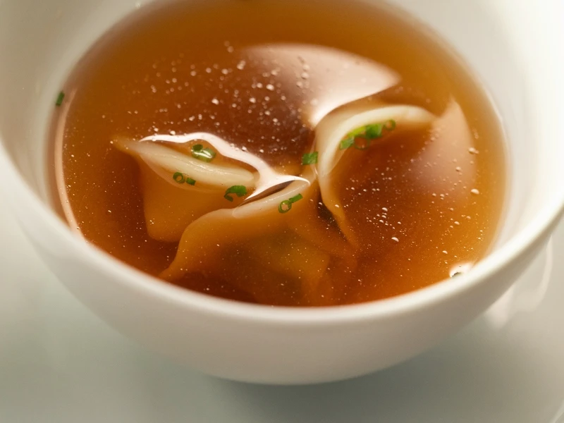 熟悉宜蘭的人都知道,來到這里總少不了要吃碗乾麵和餛飩湯。這道料理就以為靈感,從最日常的味道出發(fā)。主廚將餛飩改以義大利湯餃(Tortellini)方式呈現(xiàn),結(jié)合義式技法與宜蘭風(fēng)土,創(chuàng)作出屬于獨家版本。湯底以豬骨、三點蟹慢火熬製,再以法式澄清湯的方式處理,湯色清亮、香氣濃郁,入口后帶著細緻的鮮味。三顆湯餃象徵宜蘭的三種風(fēng)景,包括山里的鹹豬肉、海里的鮮蝦,以及田間的三星蔥。