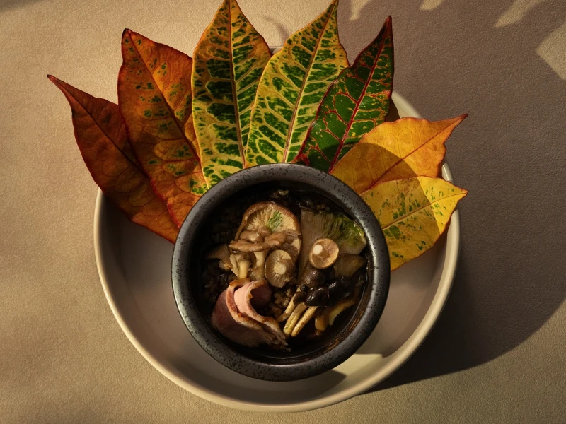 這道料理致敬的是茶泡飯(茶漬け)延伸而來,也是在日本被視為能調(diào)養(yǎng)身心的療癒之食。在長期與獵人與採集野菇的職人合作,依照季節(jié)與當日採集到的食材設(shè)計菜單。主廚還提到,他的每天都會帶來不同種類的菇,而那天有什么,他就煮什么;野味則來自職業(yè)獵人打到的當日獵獲。