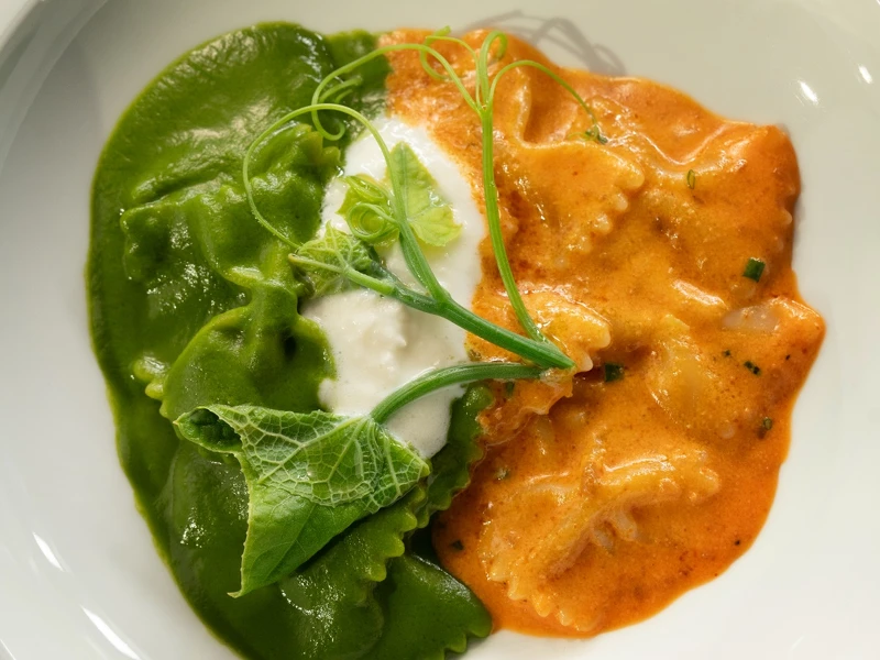 其靈感取自義大利國旗的三色,也象徵與的情誼。左側(cè)的綠色代表 ,Chef Matteo 以綠花椰菜、菠菜、芥藍和九層塔打成青醬,帶出自然清新的草本香氣,并加上龍鬚菜點綴;中間是白色柔滑的絲綢乳酪;右側(cè)則是的紅色版本義大利麵,以臺灣烏魚子融合辣味奶醬,展現(xiàn)濃郁又帶微辣的風(fēng)味。顏色像是義大利國旗在餐桌上的延伸,加上選用蝴蝶結(jié)義大利麵(Farfalle),呼應(yīng)的 logo 造型。