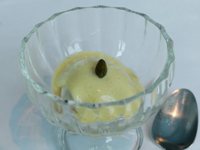 第一道甜點以義大利三大經(jīng)典風(fēng)味,開心果、橄欖油與沙巴翁為靈感。以開心果製成義式冰淇淋,底部加入黑橄欖油,帶出柔和果香與微苦的尾韻,增添整體的深度與層次,最后擠上香檳沙巴雍,清爽氣泡與優(yōu)雅酸香使口感既輕盈又豐富。開心果香甜細膩,與橄欖油的獨特風(fēng)味形成對比,展現(xiàn)義大利傳統(tǒng)技法與現(xiàn)代創(chuàng)意的結(jié)合,不僅重現(xiàn)經(jīng)典風(fēng)味,也帶來新穎而精緻的體驗。