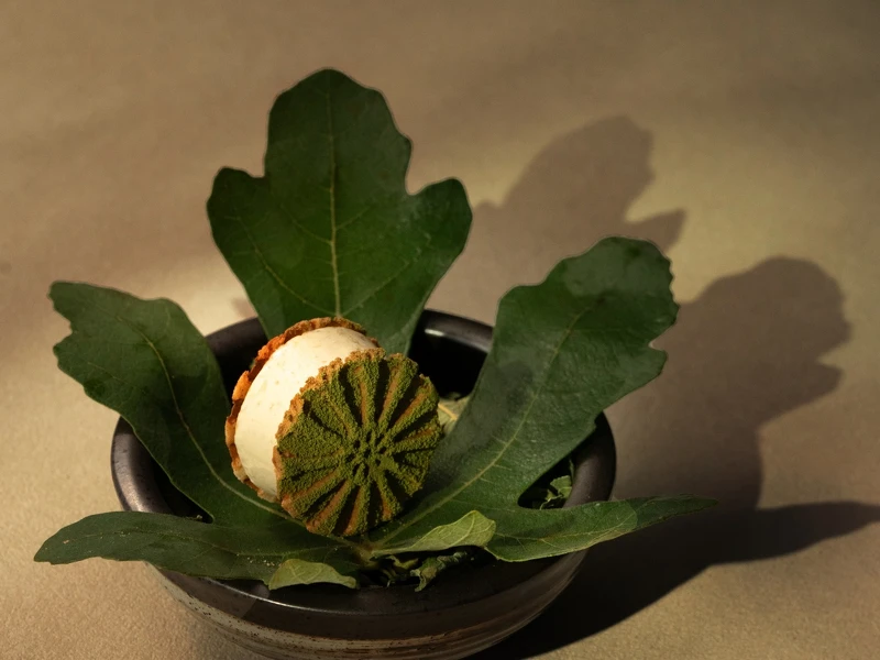 這道甜點結(jié)合了義大利傳統(tǒng)冰糕(Semifreddo)與鐵模餅(Ferratelle),且同樣延續(xù) Chef Matteo的理念。一般料理多半只取無花果果實,他卻連果葉也運用其中。他將葉片曬乾后磨成粉,與抹茶混合灑在表面,帶出自然的草本香氣;中層是以無花果製成的冰淇淋餡,香氣柔和清甜;外層的薄餅則以主廚從義大利家鄉(xiāng)帶來的鐵模壓製而成,圖案靈感來自教堂窗花,象徵時間與記憶的印記。由于模具僅有一個,每片都需手工壓製、雙面烘烤,光是這道甜點就要花上近二十小時準備,做法相當繁複,但呈現(xiàn)出細緻又優(yōu)雅的成果。